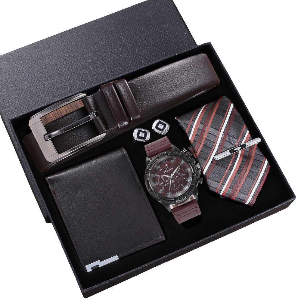 The Prestige 5-Piece Gift Set combines timeless elegance with functional sophistication. Inside the luxury box, you’ll find a refined quartz watch, a sleek leather-style wallet, a classic belt with stainless steel buckle, an elegant tie with clip, and premium cufflinks.